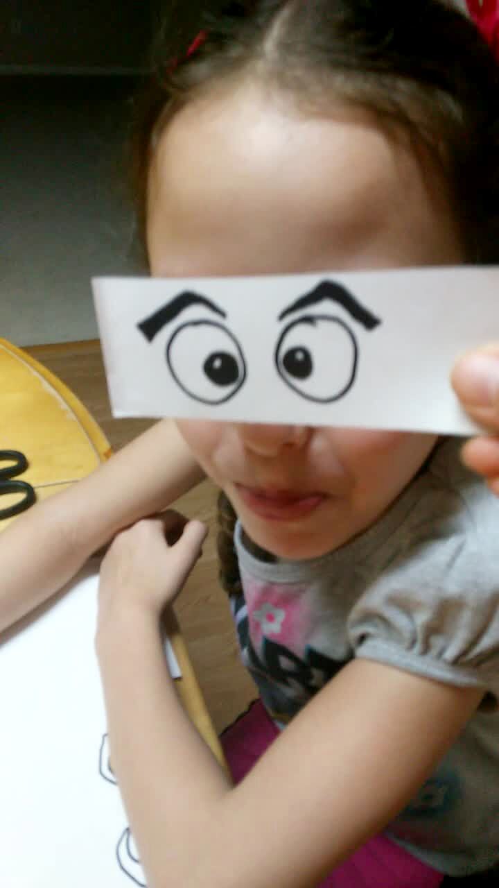 A person holds hand drawn paper eyes over a young girl's face indoors. AA: Make some paper peepers.