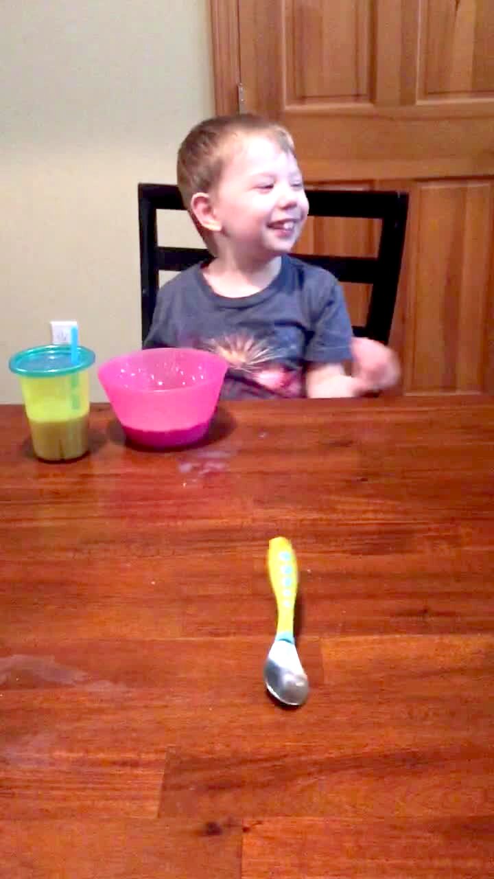 A young boy laughs when his father uses a magnet under the table to move the boy's spoon. AA: Blow a Kid's Mind with Magic.
