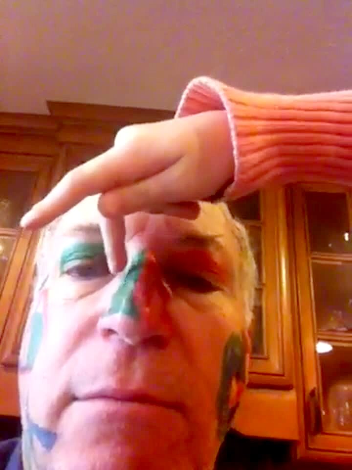 A young girl points at her grandpas face after she painted him. She points out a candy cane and a welcome sign she drew. He says he's all ready for Christmas now.