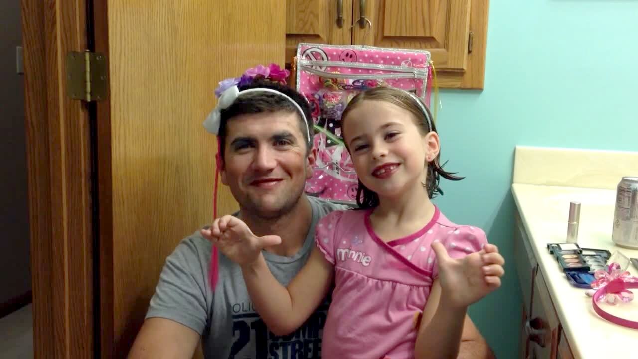 A tot girl happily indicates that she has put make up on her father at home, as well as a bow in his hair.