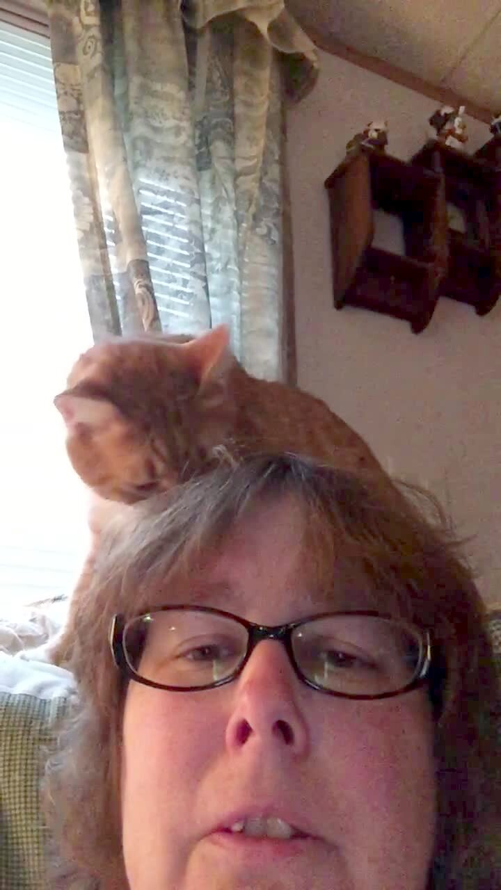Cat tries to jump from dining room chair onto teen girl's shoulder. She ducks away, the cat misses & hits the kitchen counter, and falls to the ground.