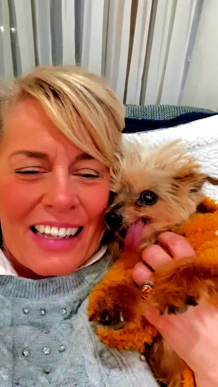 Woman sits on the living room floor & pets a small dog in her lap. The dog shakes its paws very quickly when woman rubs its ears.