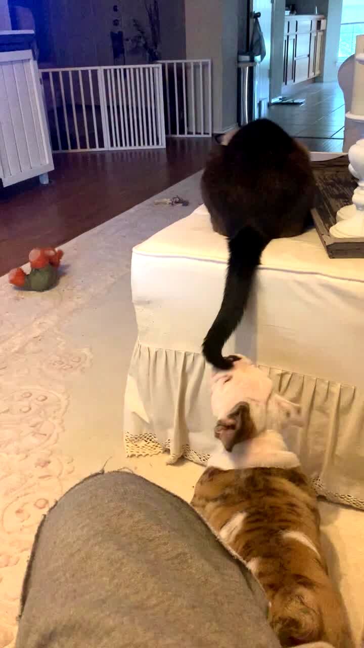 A puppy nips at a cat's swaying tail. Finally the cat turns around, swipes at then hisses at the dog.