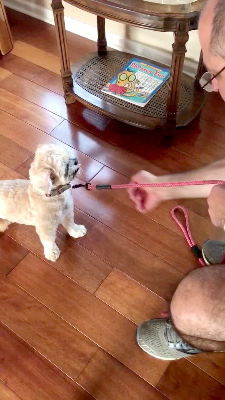 A dog growls and bites a man as he tries to take his leash off in the living room, but then a teen girl steps in and takes it off immediately.