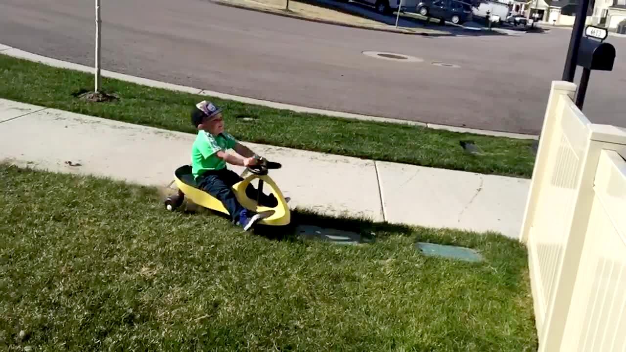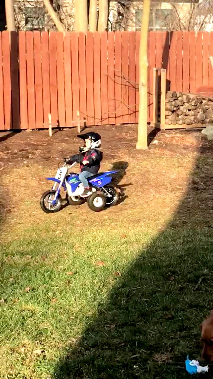 Young boy rides small motorcycle, forgets to hit the brakes, crashes into a fence in backyard. with recovery