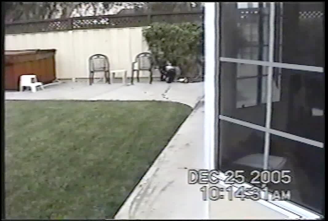 Teen boy rides a dirt bike off a ramp in the driveway, crashes into a big pine tree, and disappears from view. Motorcycle.