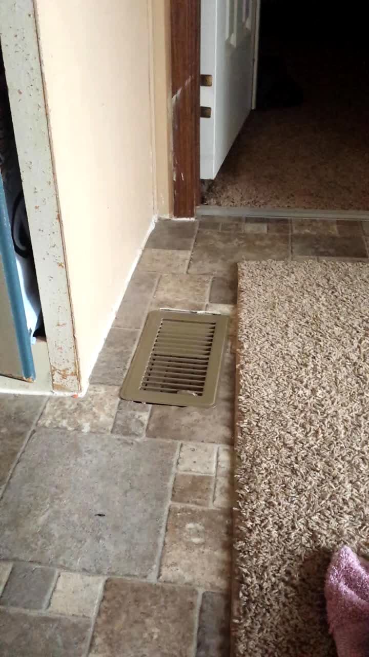 Cat sneaks through house and is startled by spray machine that goes off by a sensor. Cat get sprayed with air several times, keeps going back to investigate.