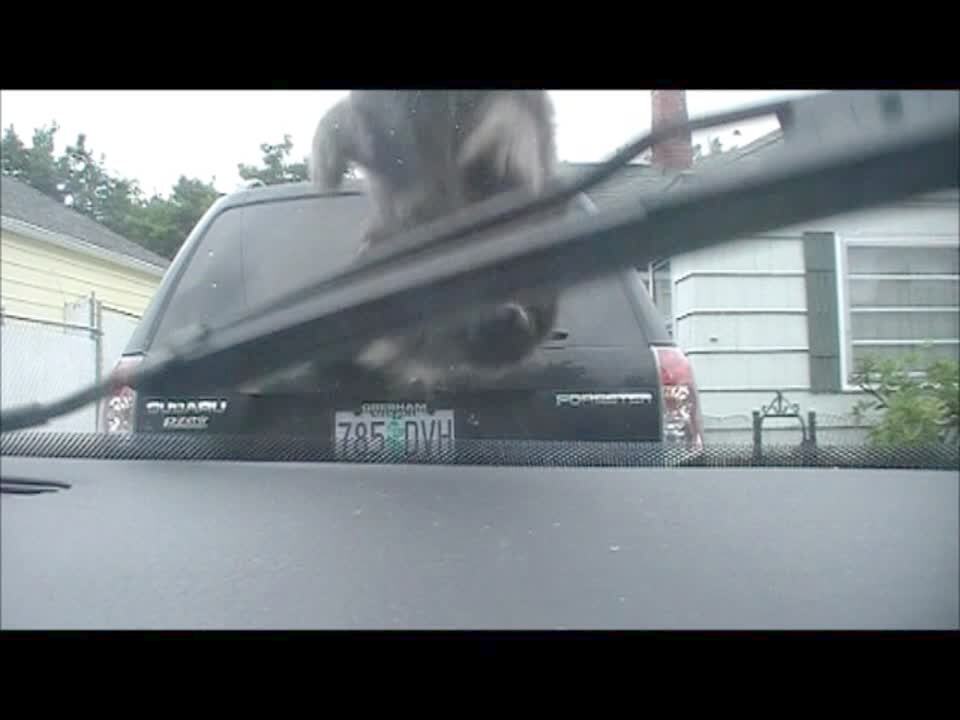 A cat on the hood of a car jumps when a man turns on the windshield wipers.