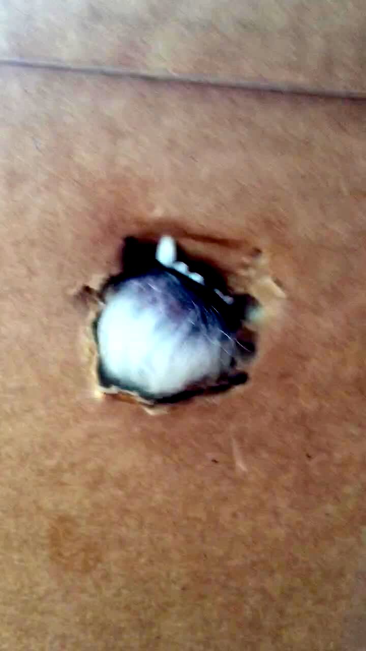 A medium-sized yellow dog paws and barks at a hole in a linoleum floor indoors and gets more spooked when a hand repeatedly pops out of the hole.