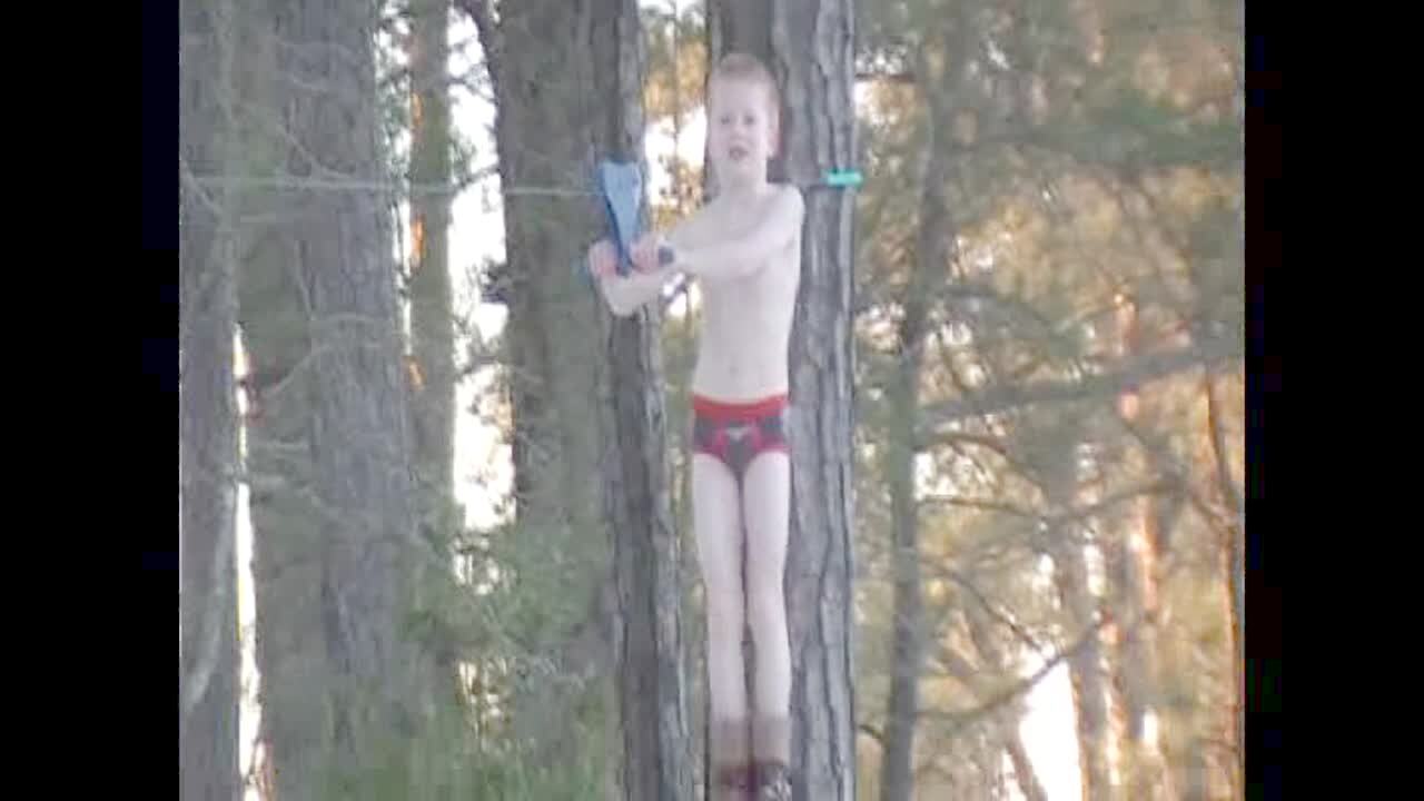 Man & young boy try to ride an old fashioned kick sled (which had blades on the bottom). Man flips over the front of the sled and lands on his son. Winter.