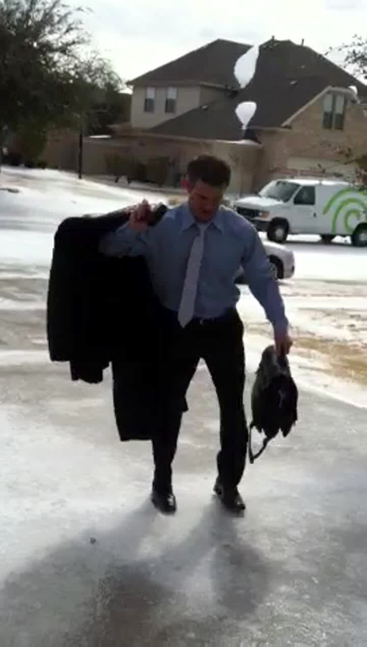 Man tries to walk up an icy driveway carrying a briefcase and a suit coat. He gets near the top of the driveway, but slides all the way back down to the road. Winter, ice.