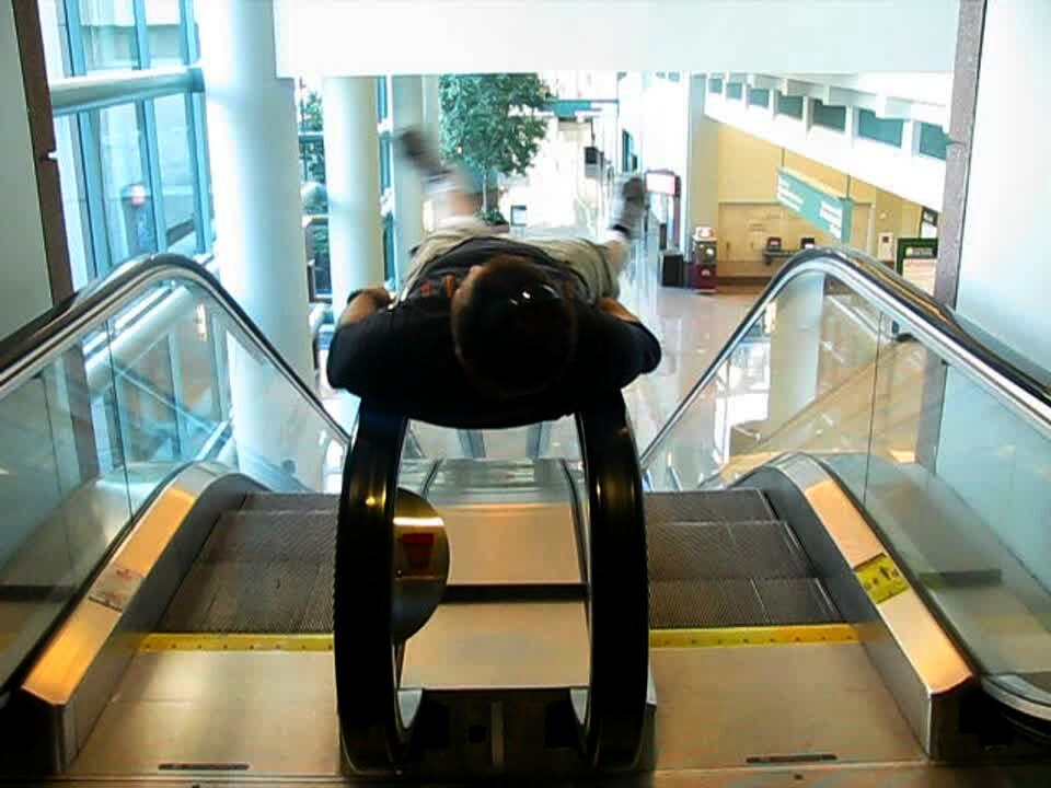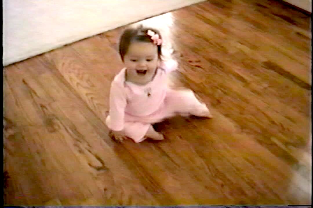 Tot girl stands on stairs and says "cheese" to the camera. Her brother is in a box behind her getting ready to slide down the stairs. She moves into his path and is catapulted down the stairs. Siblings.