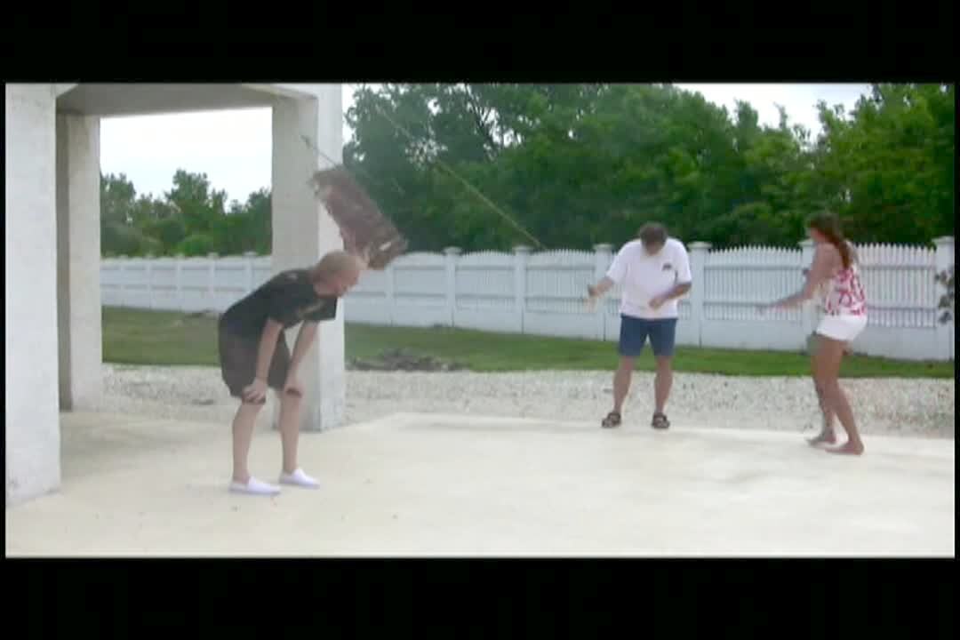 Woman rides on a mattress and gets pulled behind an offscreen car. They're tied together by a bedsheet. Long for edit. Blurry. Music plays over clip.
