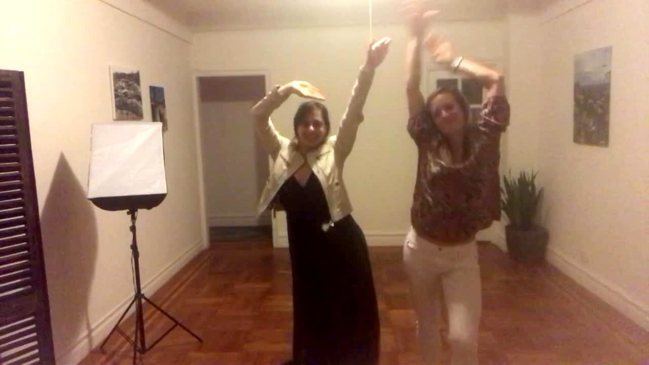 Two girls sled down a snow covered hill and knock over ten small snowmen set up like bowling pins. Winter.