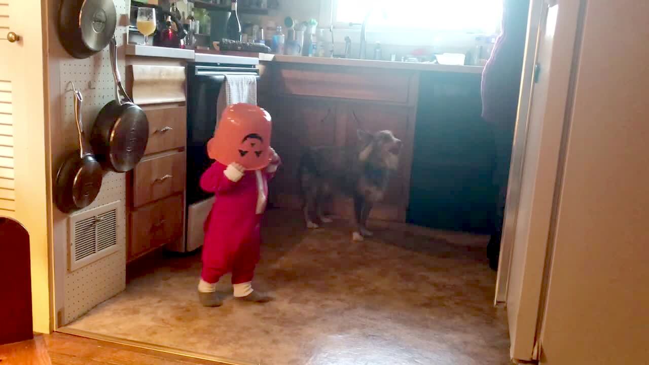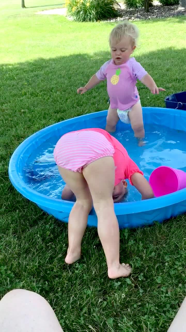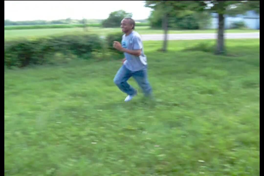 A teen girl outside drives a four wheeler and pulls a teen boy on a sled. The sister makes a sharp turn, then stops. The brother keeps going, the rope wraps around the four wheeler, and he slams into the four wheeler.