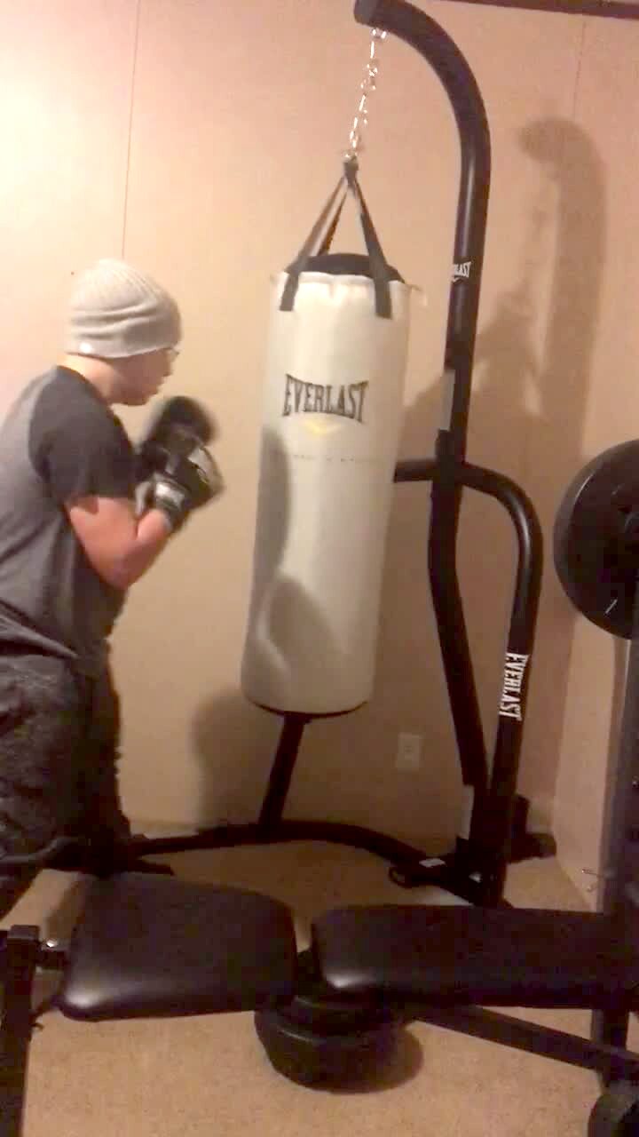 In a snow covered front yard, man drives an ATV with a small tractor buckets on it, crashes into a snowman and destroys it. Winter.
