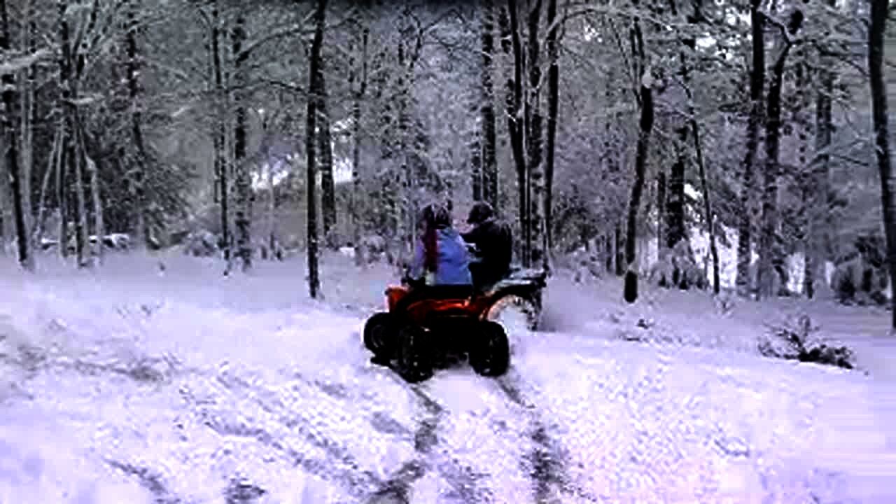 Man runs into tree on ATV, snow from tree dumps on him. USE RESUB 661162A WITH MORE FOOTAGE. Clip is only :08 long.