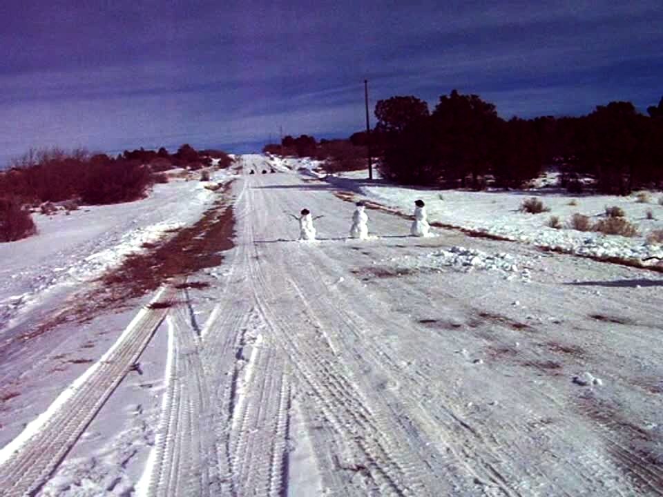 Three snowmen stand on a snow covered road. Three men sled down the road on old rail sleds, crash into and destroy all snowmen at the same time.