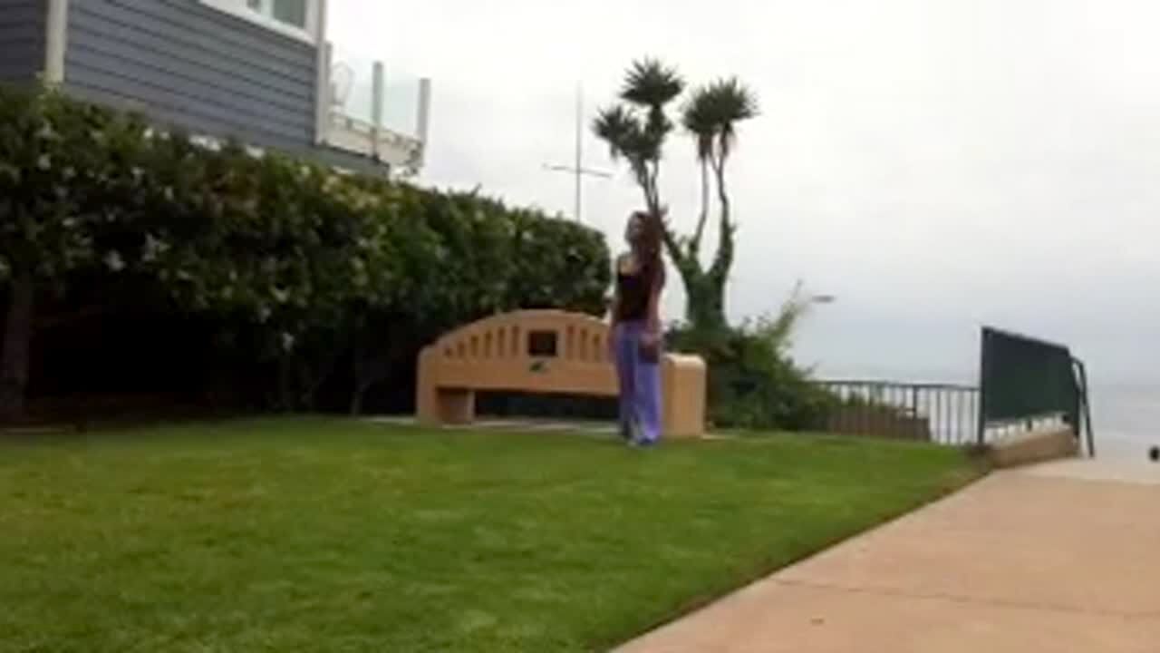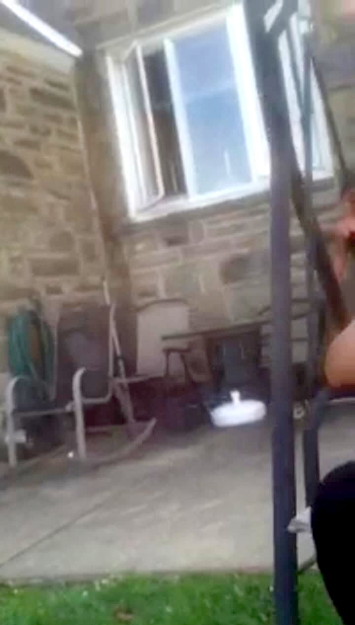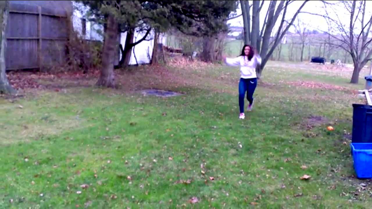 "Hopeless Handspringer" A teen girl repeatedly tries to do a front hand spring in a yard and falls every time. She is terrible at it. Mom says she is going to break her neck. Cartwheel