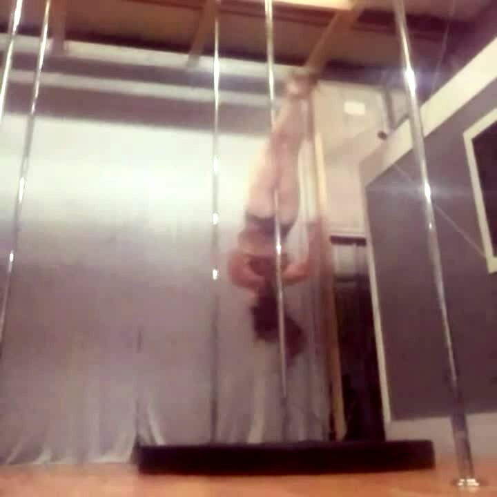 A woman pole dances on a lamp post in a hotel room, and then it breaks and she falls on the floor as the glass shatters.