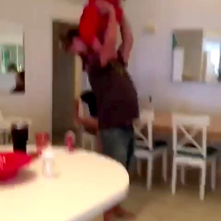 A man and a teen girl do a TikTok dance and he tries to roll across her back but they both fall to the ground in the backyard. Music rights not cleared.