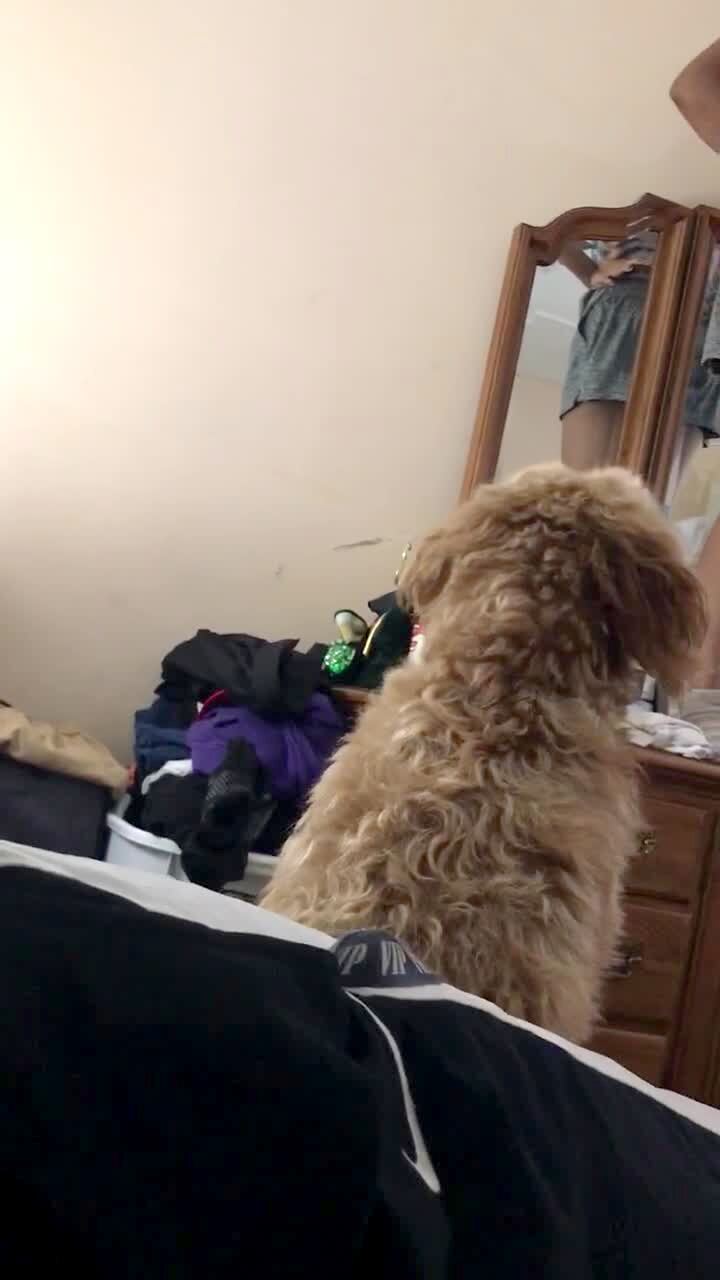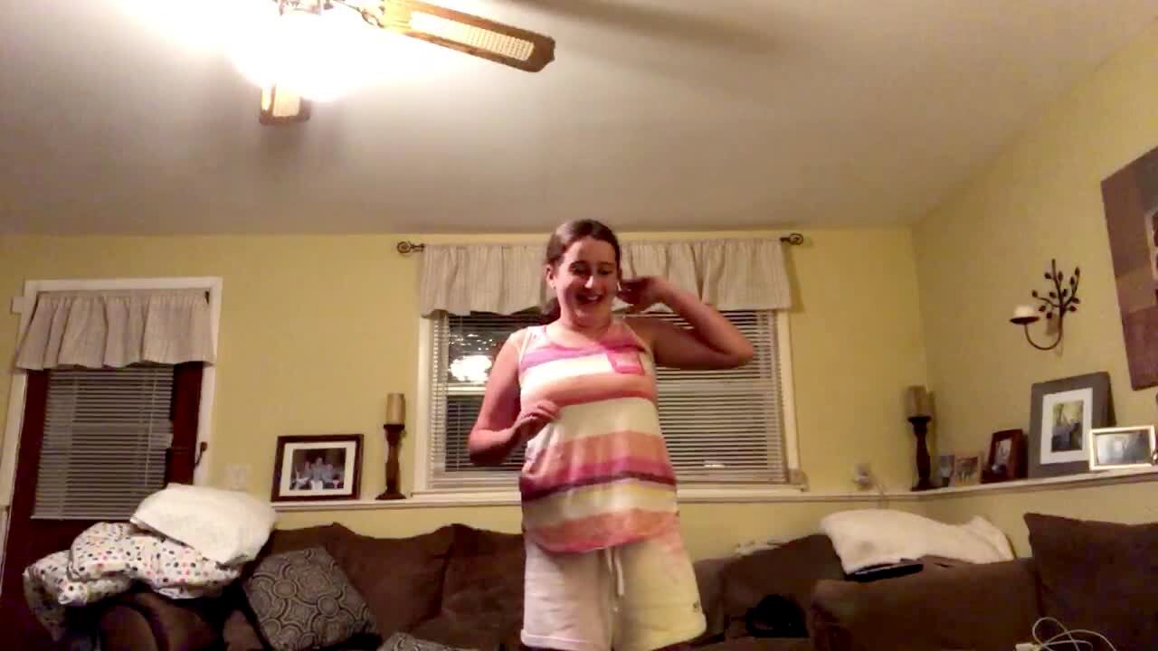 A teen girl in a bedroom lip syncs and dances on a bed and hits her head on a ceiling fan.