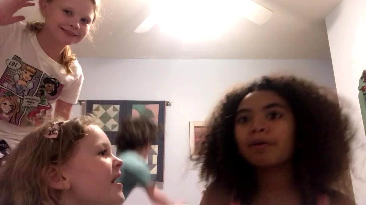 Three young girls and a young boy dance to music on a bed in a bedroom. Around 0:18 one of the girls pushes another girl and she falls off the bed and cries. Another girl says "Okay we're gonna cut on that" and turns off the camera.