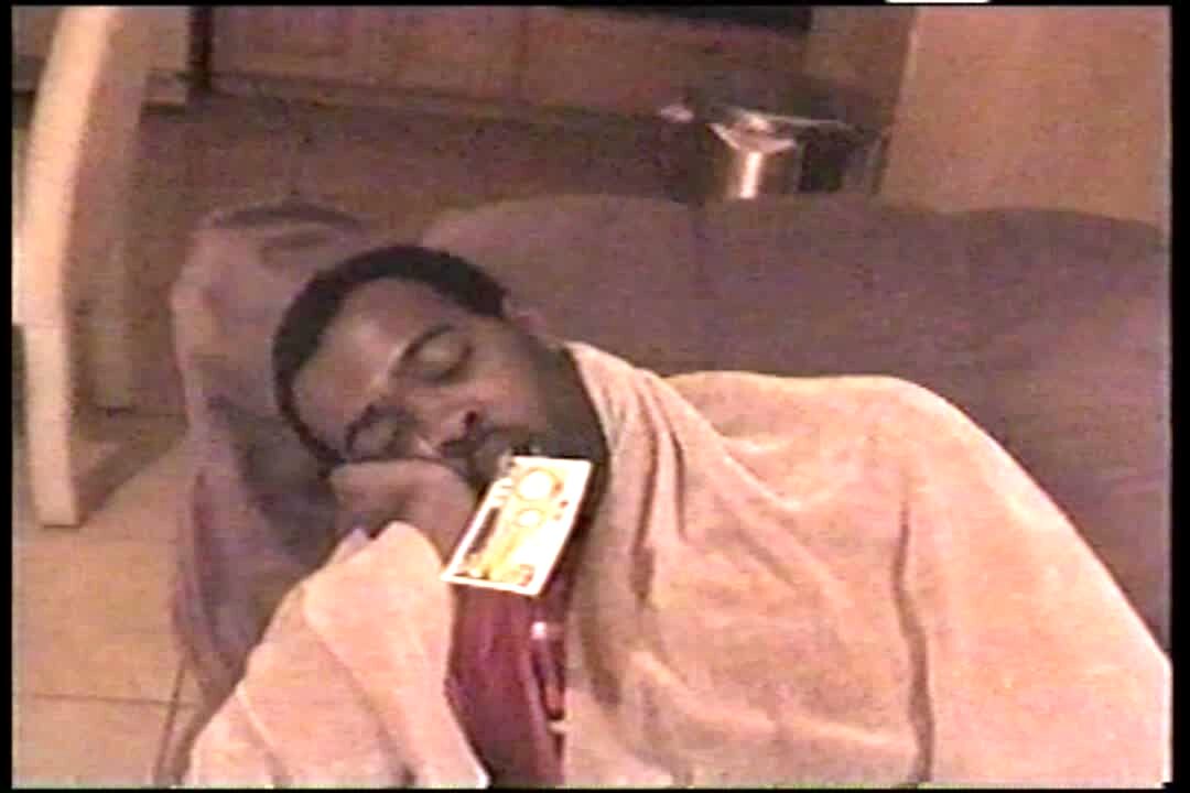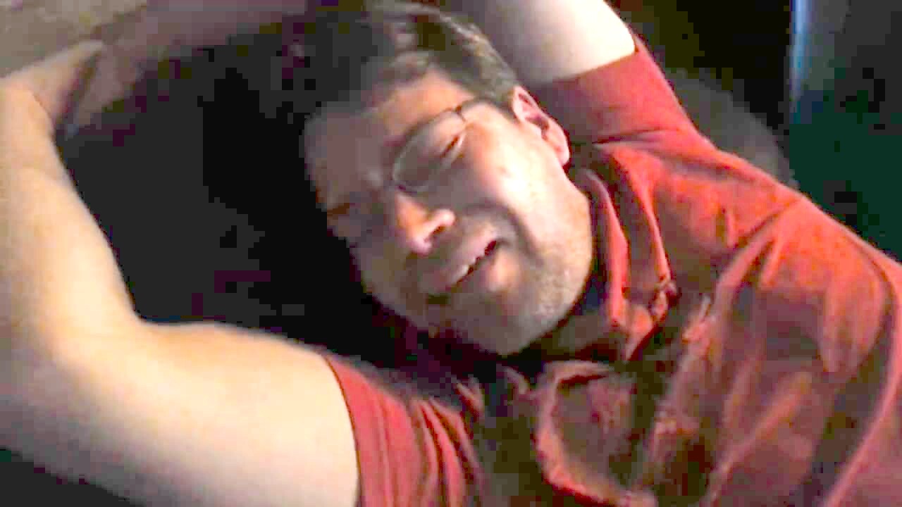 Man snores very loud & makes funny noises like he's choking. Other man videotapes it in night shot. Sleep.