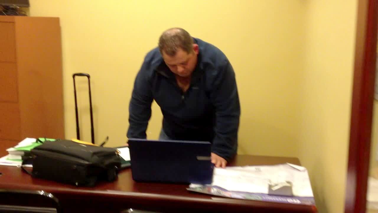 A man sleeps standing up at his desk in an office and almost falls down. The man behind the camera laughs hard.