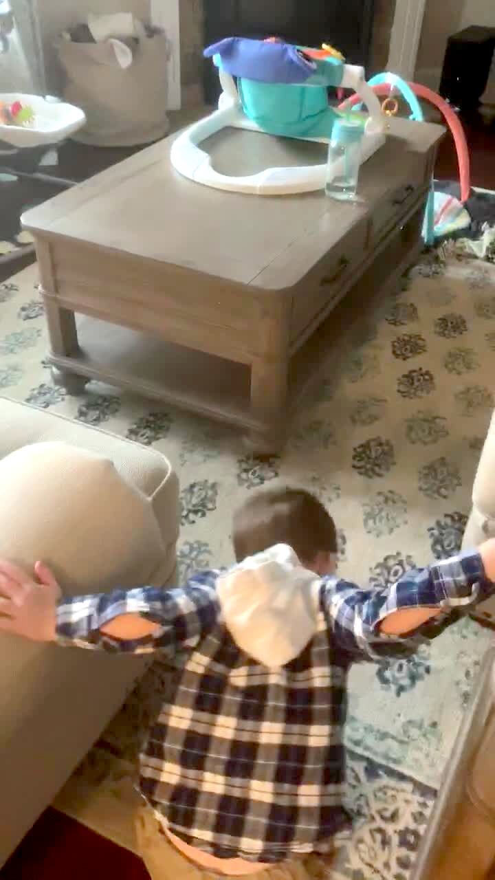 A tot boy looks for his lollipop in the living room while his mother asks him where it is until he touches his head and finds it in his hair.
