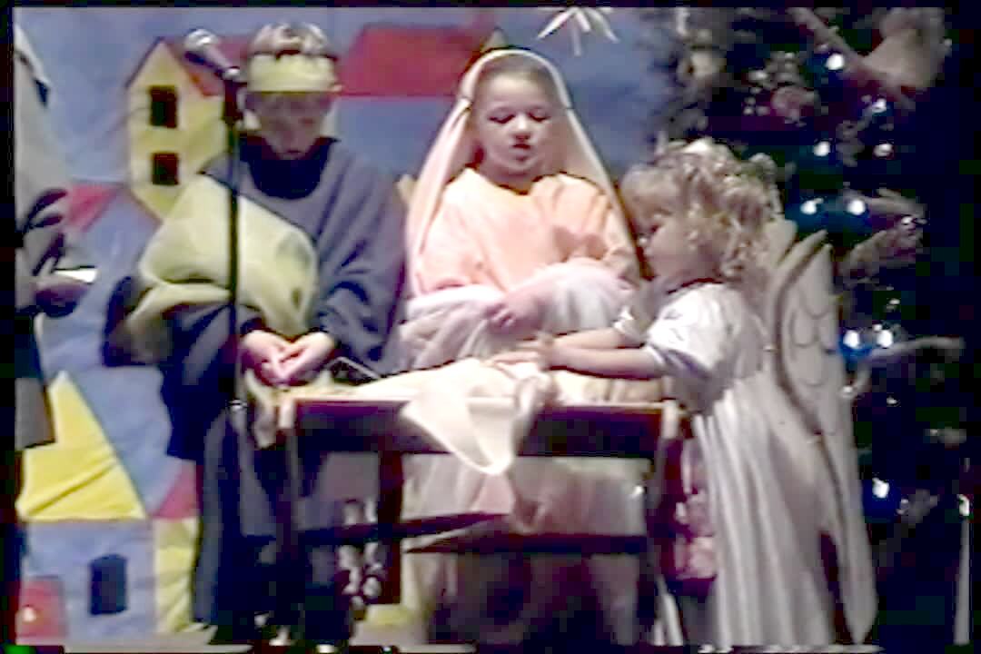 During a Christmas recital, young girl dressed as an angel falls down, knocking baby doll Jesus out of the manger onto the floor. Performance problems.