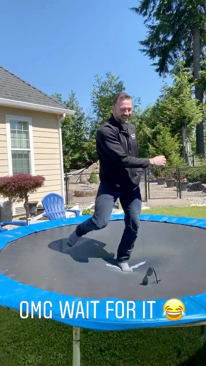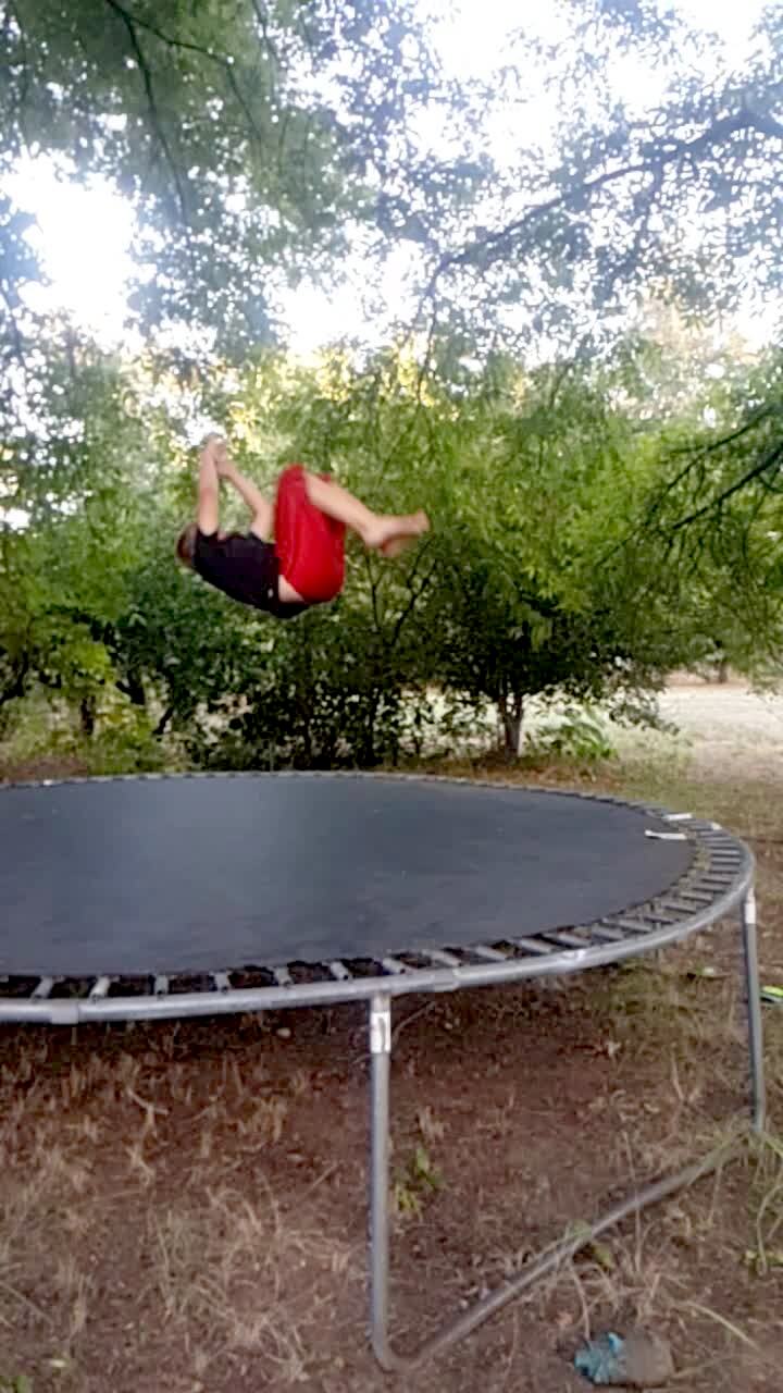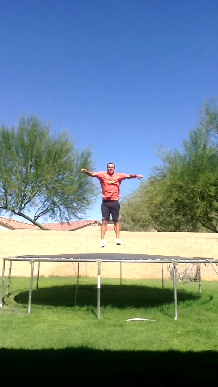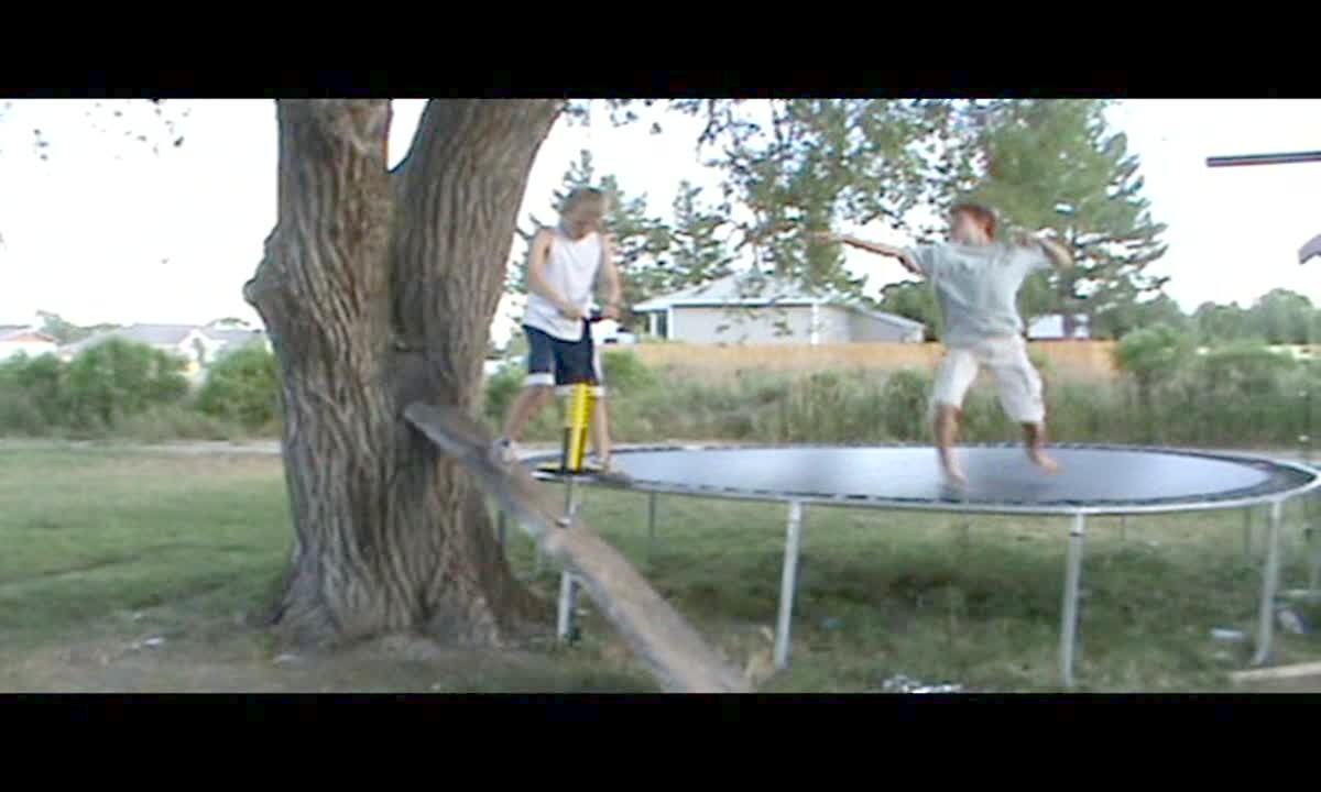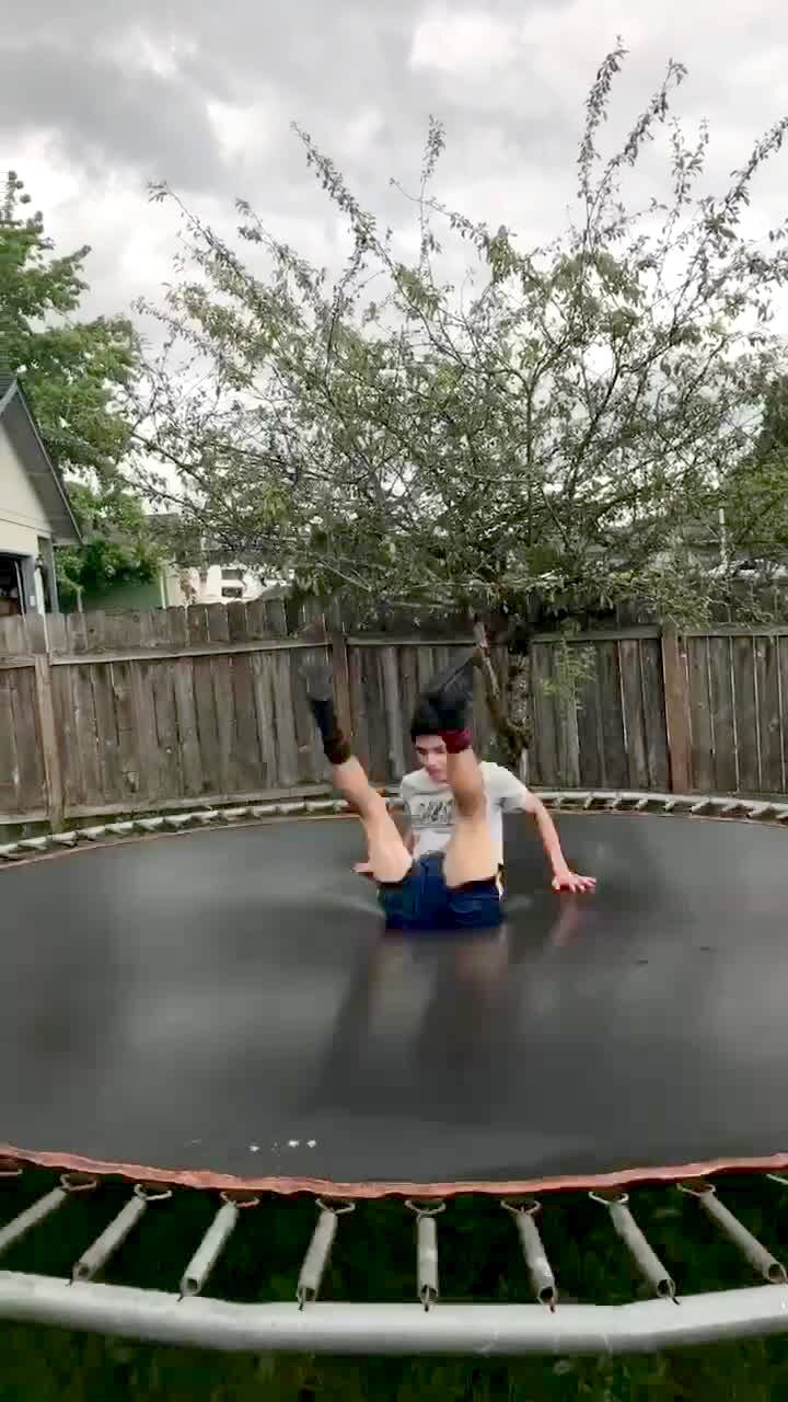 Teen boy jumps on a trampoline. He jumps off and lands hard on the ground. Short tail. See W108830/ 641579A for additional tails.