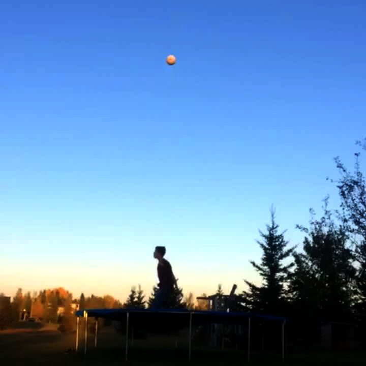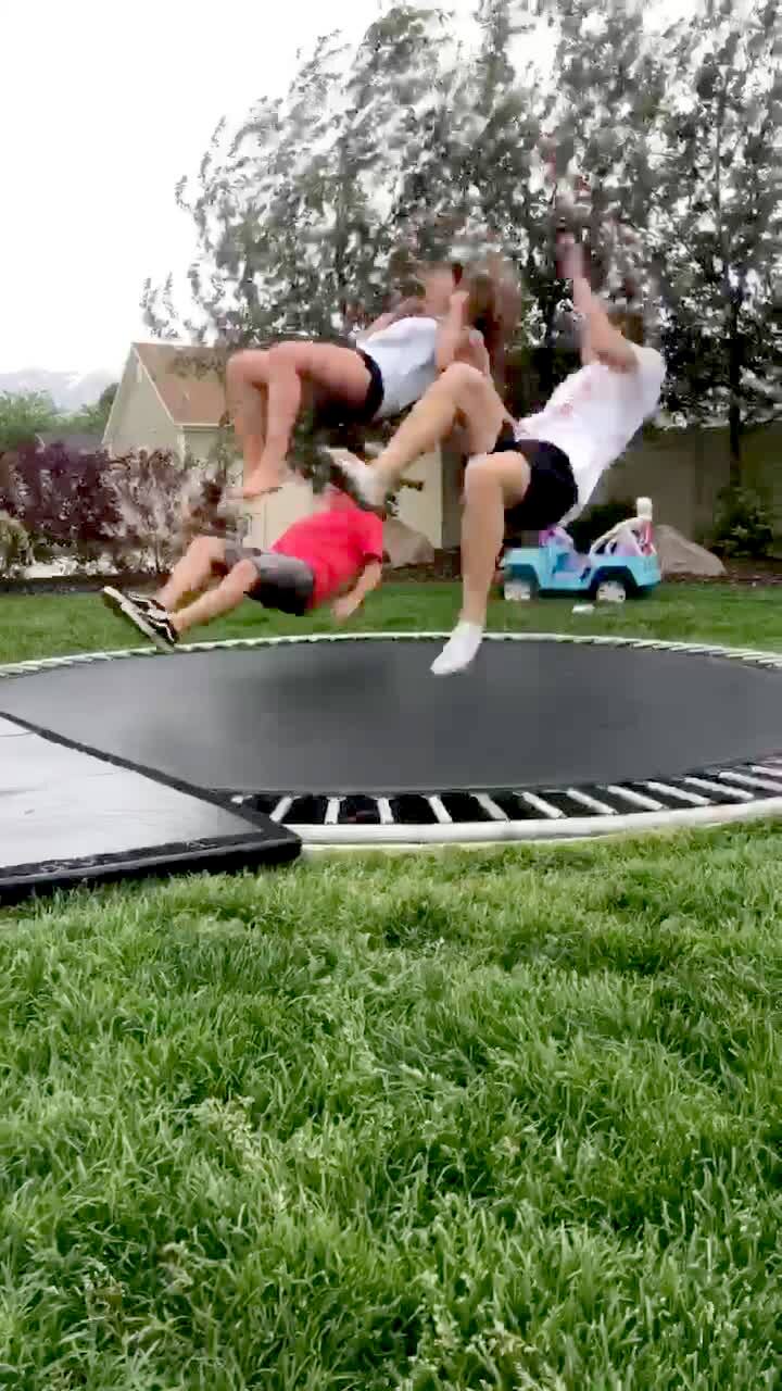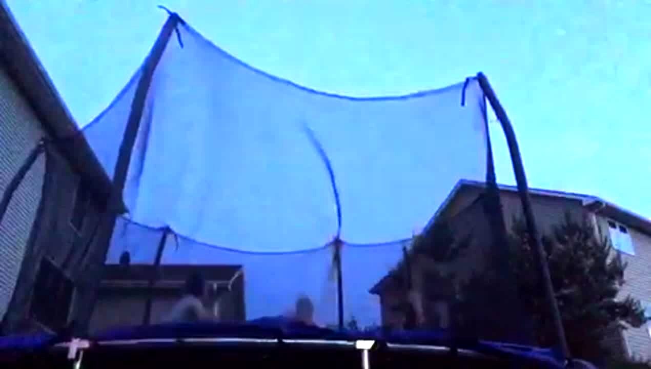 A teen boy does a back flip on a trampoline and his head gets stuck in the side of the trampoline.