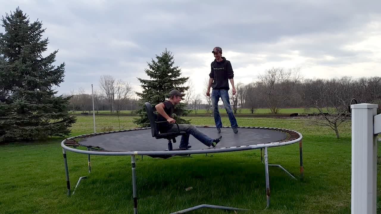 Two teen boys jump on a trampoline, one of them in a rolling chair. The teen boy in the chair falls backwards and flips off of the trampoline, and his head gets stuck in the net.