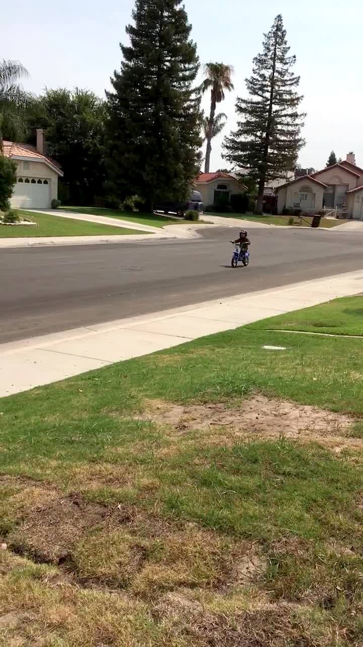 A young boy rides a dirt bike off a ramp in the road and falls after he lands. Short tail