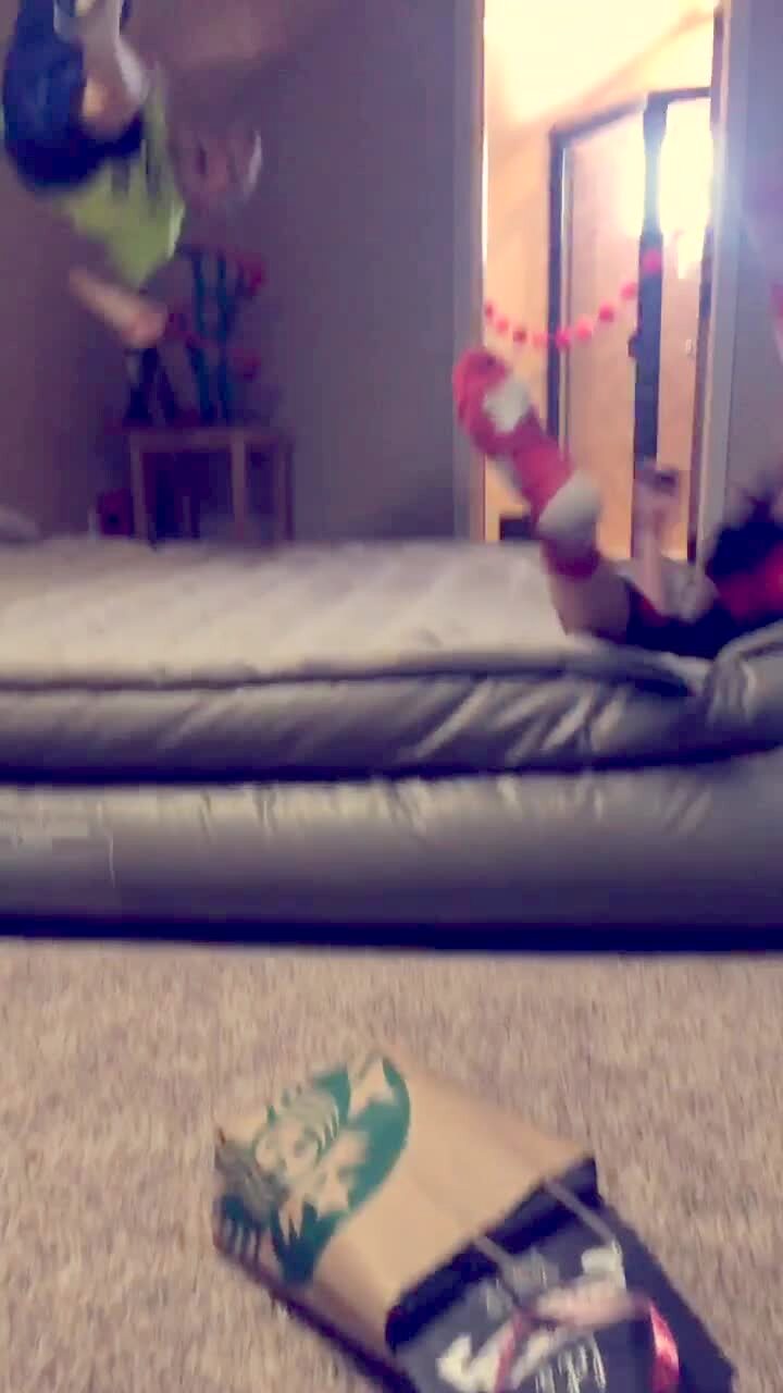 A young boy lays on an air mattress and is launched in to the air twice, the second time he lands on the floor.