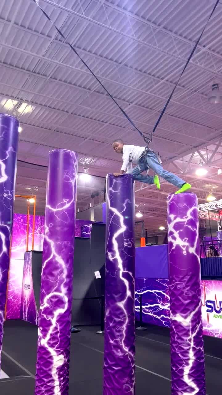 A young boy attached to wires climbs a series of padded beams at a fun center. He gets too high and decides to jump off. When he jumps, he flips upside down and flies straight into the woman behind the camera.