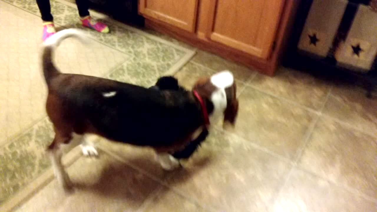 A tot girl says "kick it" repeatedly while she waits for an exercise ball. The ball comes from off camera, bounces off the wall behind the girl, and knocks her down when it hits her in the back of the head.