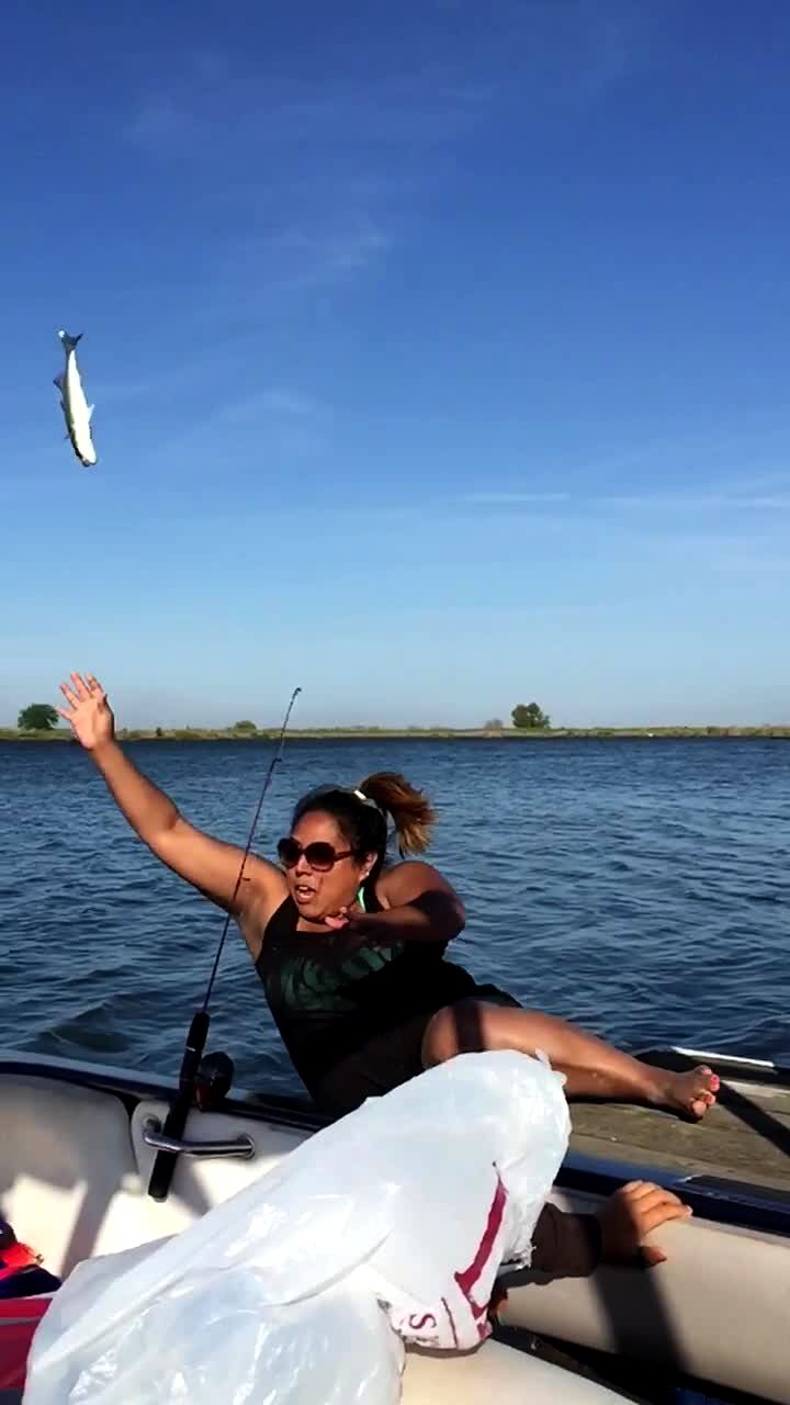 A woman cheers while she catches a fish on a boat, then she slips and falls into the water.