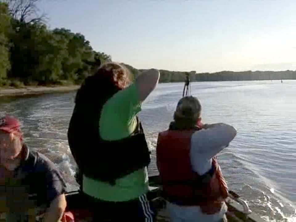 A woman records a video while she rides in a boat through a lake and a fish jumps out of the water and hits the camera.