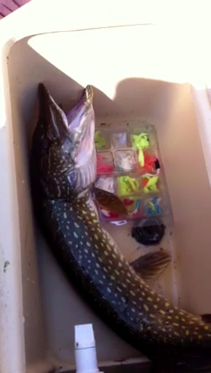 A woman poses with a fish on a dock before she falls off and throws the fish in slow motion.