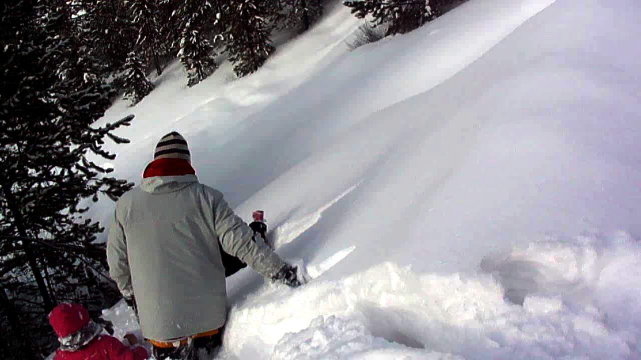 On a snow covered hill, a woman holding a baby gives a young girl a snowball. The girl throws the snowball at the camera man and gets snow all over the camera. Action in first 30 seconds.