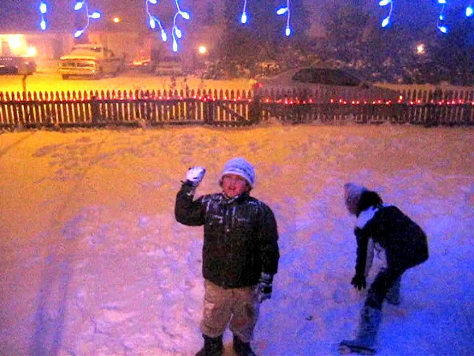 Girl & boy play in the snow. Girl throws a snowball at the house & a big mound of snow hits her in the face, she laughs. Winter.