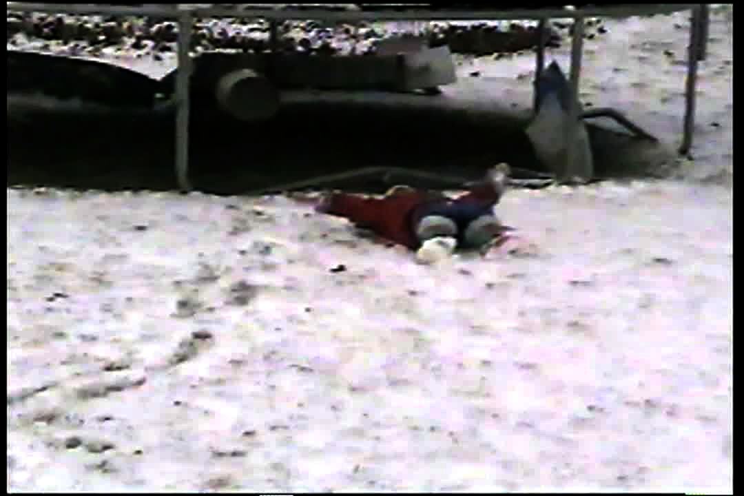 Tot girl tries to make a snow angel but does it wrong. She puts her hands and feet in the air rather than sliding them around in the snow. Cute.