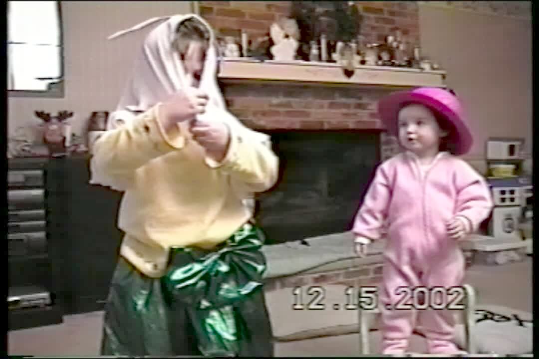 A young girl plays with a balloon and bounces it in the air above her. A woman off camera says she has "such good coordination" and as soon as she says it the girl bumps into a piece of furniture and falls to the ground.