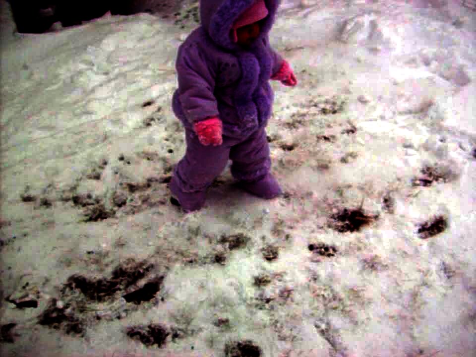 A tot girl lands on top of a small snowman outdoors, crushes it, and says "hi!" to the camera.
