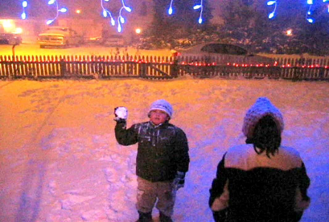 A woman does a selfie video outdoors in the snow. Behind her a young boy attempts to catch a massive snowball. The snowball hits him in the face and he falls over. He smiles and the woman laughs.