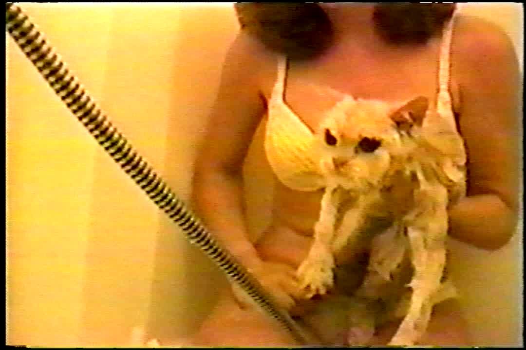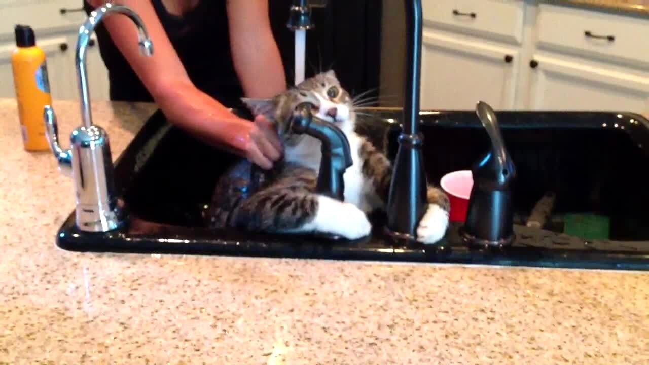 Woman tries to give a cat a bath, sounds like the cat is saying "no." Cat fights woman to get out of the water & yells.
