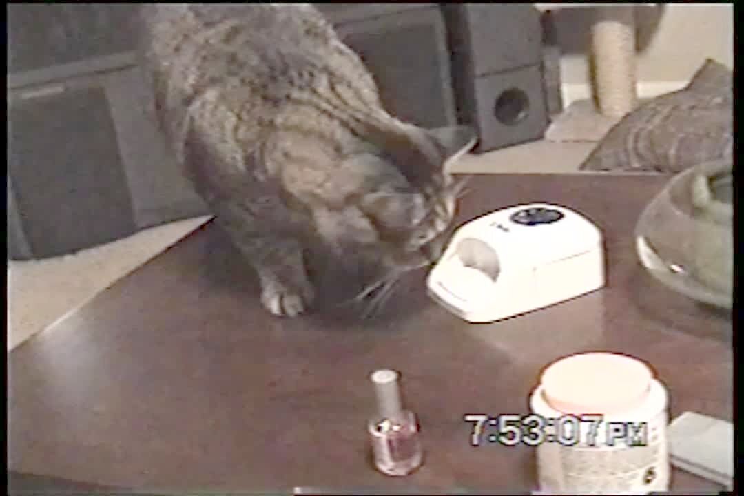 Woman puts her fingers into automatic fingernail dryer. Cat hops onto table & puts its paw into it. Silly pet trick.
