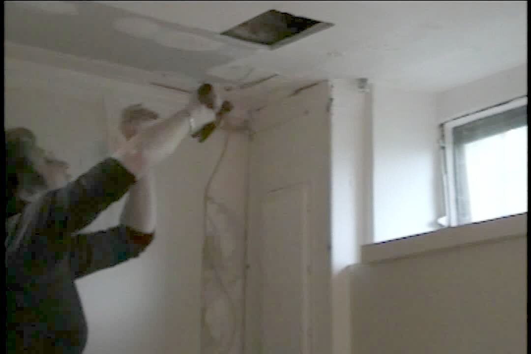 A cat swats at a flap that covers a vacuum system in a wall. She gets the flap to stay open and a vacuum sound is made, then she punches is closed.